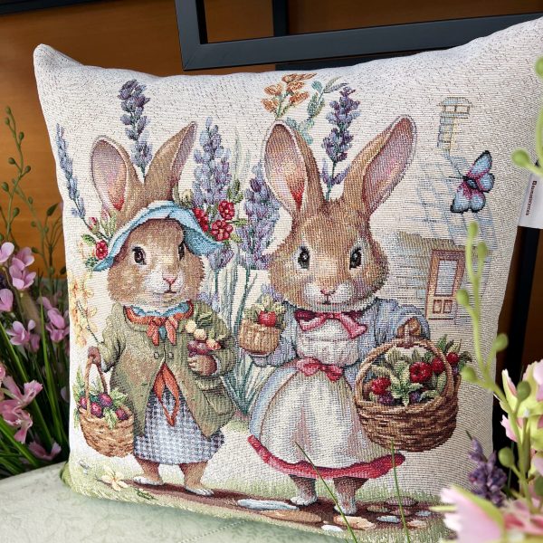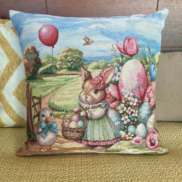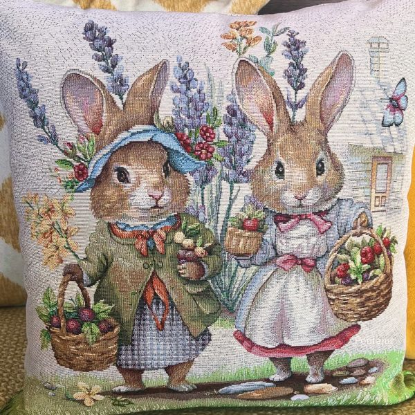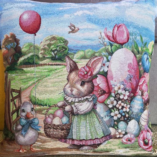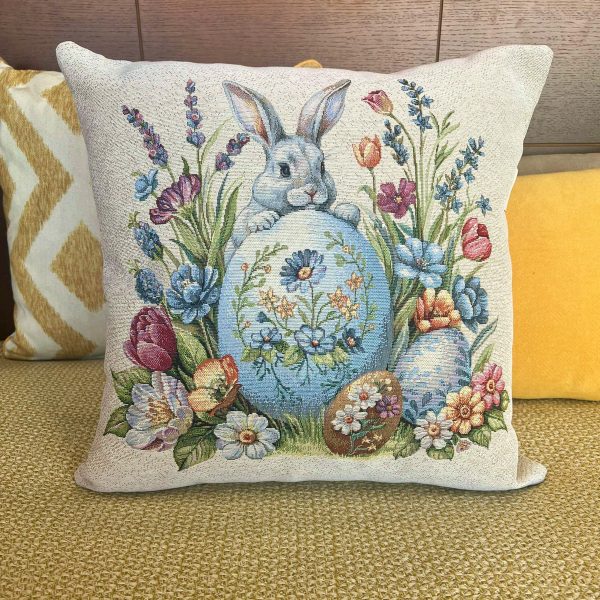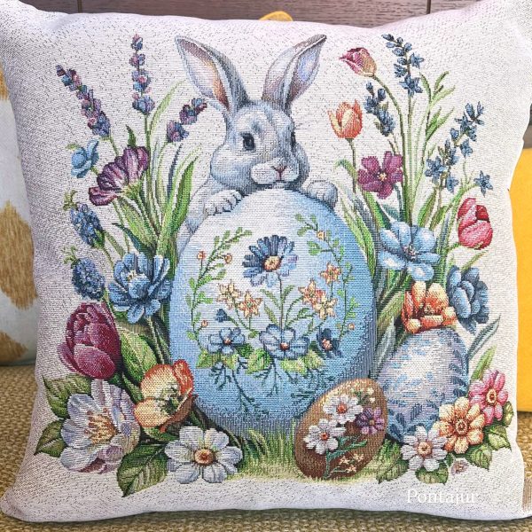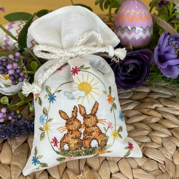•Bordado central com uma coelhinha rodeado por flores coloridas — muito associado à primavera/Páscoa
