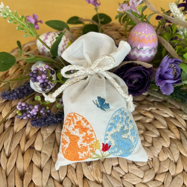 Com um padrão floral em tons de amarelo e um bordado de COROA DE PÁSCOA cheio de tradição.
