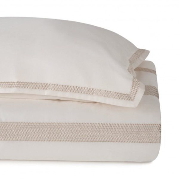 Almofadas 65x65cm com aplicação de barra bordada nos 4 lados.