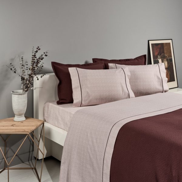 As fronhas de almofada são estampadas como o lençol de cima e tem aplicação de vivo bordoux nos dois lados.