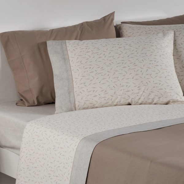 O lençol de cima é bege com estampado em folhinhas em tons cinza e o lençol de baixo é estampado em cinza claro.