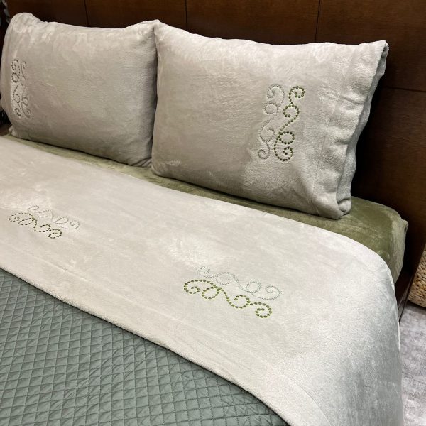 Jogo de lençóis em microcoralina bege com bordado verde no lençol e nas fronhas de almofada.