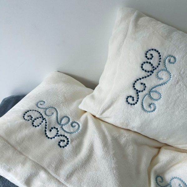 Jogo de lençóis em microcoralina pérola com bordado azul no lençol e nas fronhas de almofada.