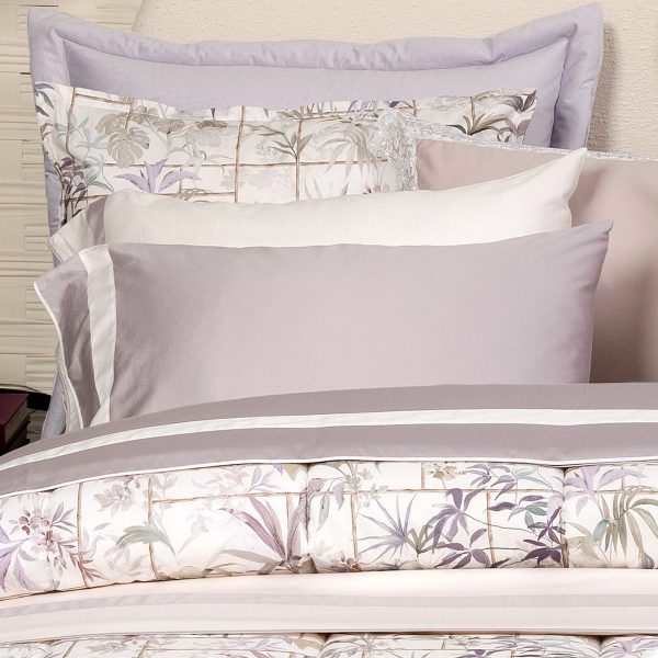 Jogo de lençóis lilás com aplicação de barra e vivo cor pérola no lençol de cima e nas almofadas, num lado.