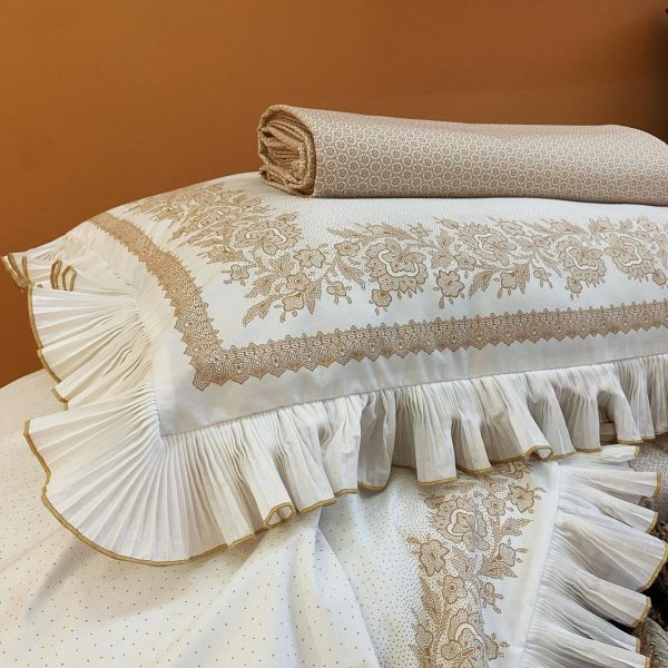Este jogo de lençóis com estampado bege, tem aplicação de folho plissado branco.