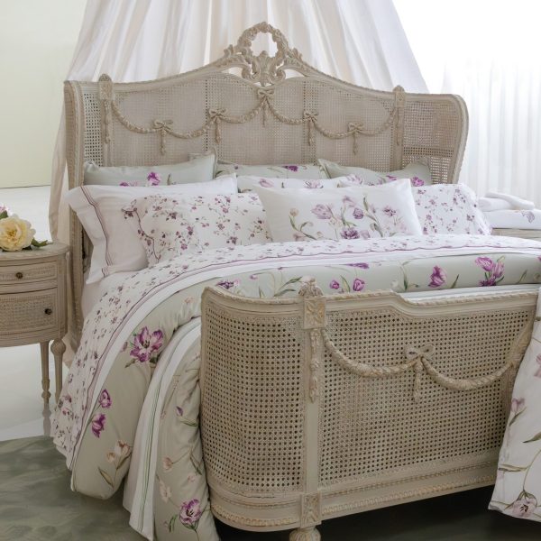 Jogo cama em tecido algodão percal com ponto aberto e bordado branco na barra. Almofadas com ponto aberto e bordado nas laterais.