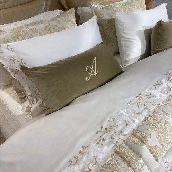 Jogo cama em tecido cetim algodão com bordado em bege na barra. Almofadas com bordado num lado.
