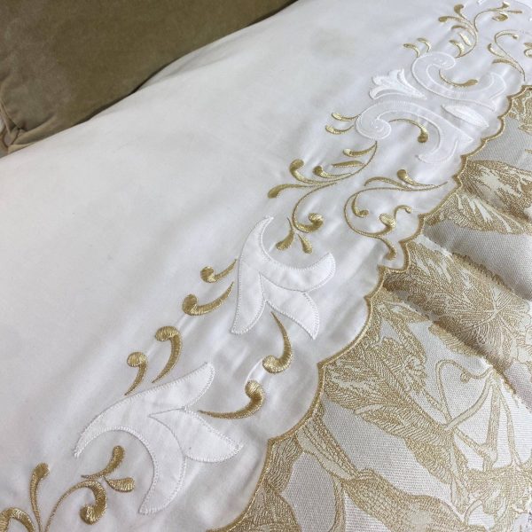 Jogo cama em tecido 100% algodão cetim branco com bordado dourado e aplicações brancas na barra do lençol de cima e almofadas (um lado). Lençol de baixo liso branco.