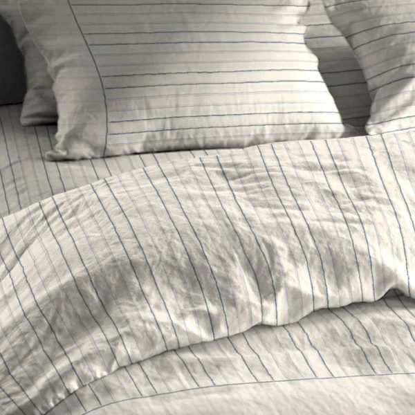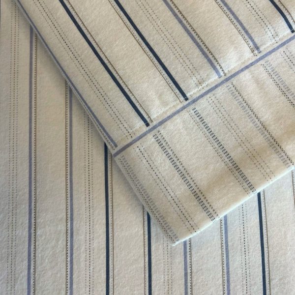Produzidos em flanela de algodão, este jogo de lençóis tem um padrão contínuo de riscas com tonalidades de azul.