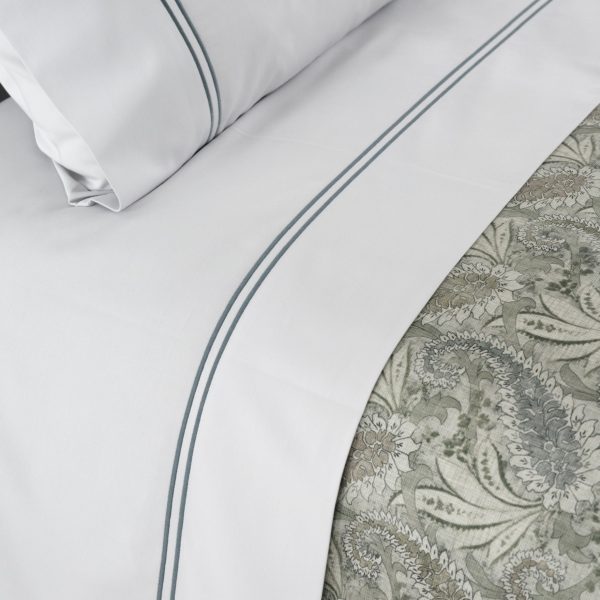 Jogo de lençóis liso azul com aplicação de vivo e bordado de rolinho (risca) cinza na barra do lençol de cima e nas fronhas de almofada, num lado.