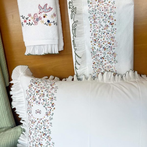 O lençol de cima tem aplicação de barra bordada com ramos.