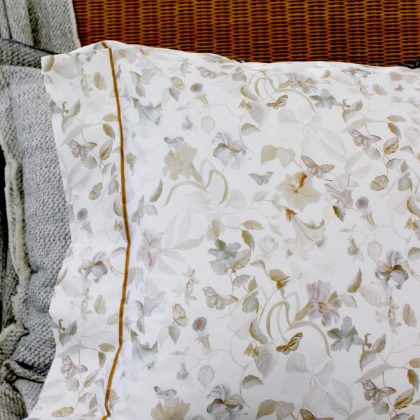 Jogo de cama bege claro com estampado digital floral na barra do lençol de cima e nas fronhas de almofada.