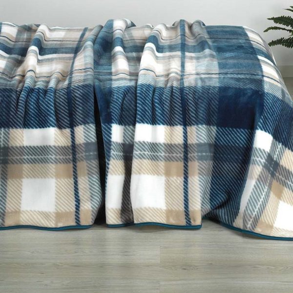 Cobertor em xadrez azul e bege.