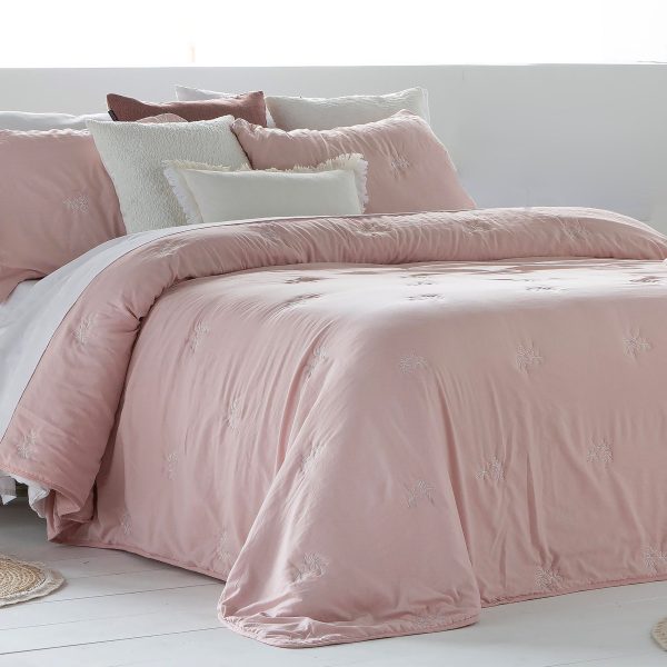 Colcha fina rosa com bordado de ramos em branco.