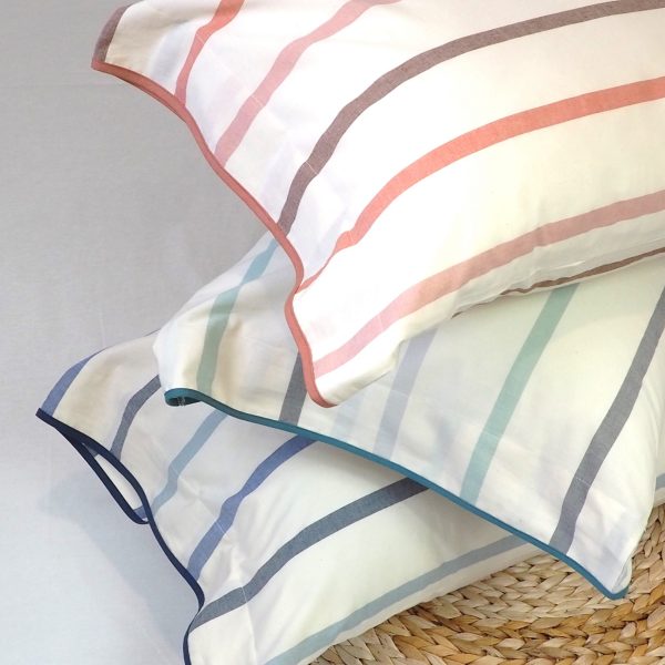 Jogo de cama/lençóis em riscas fio tinto com acabamento de vivo coral na barra do lençol de cima e na fronha de almofada.