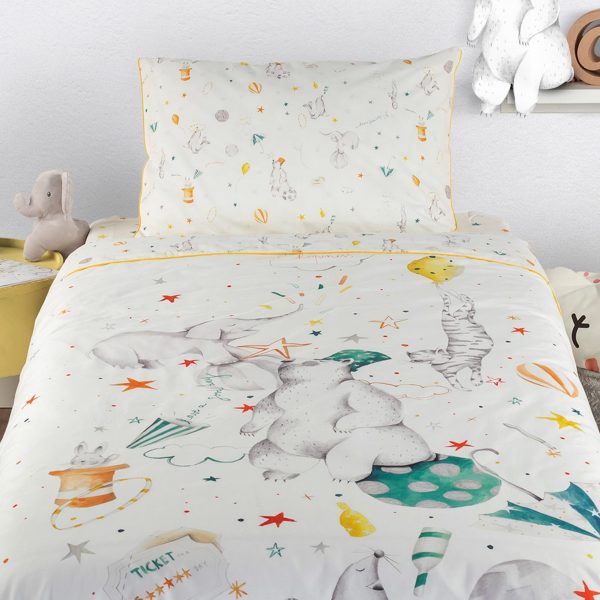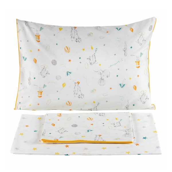 Jogo de lençóis em algodão orgânico estampado com animais. O lençol de cima e as fronhas de almofada tem aplicação de vivo amarelo. O lençol de baixo tem estrelas coloridas.