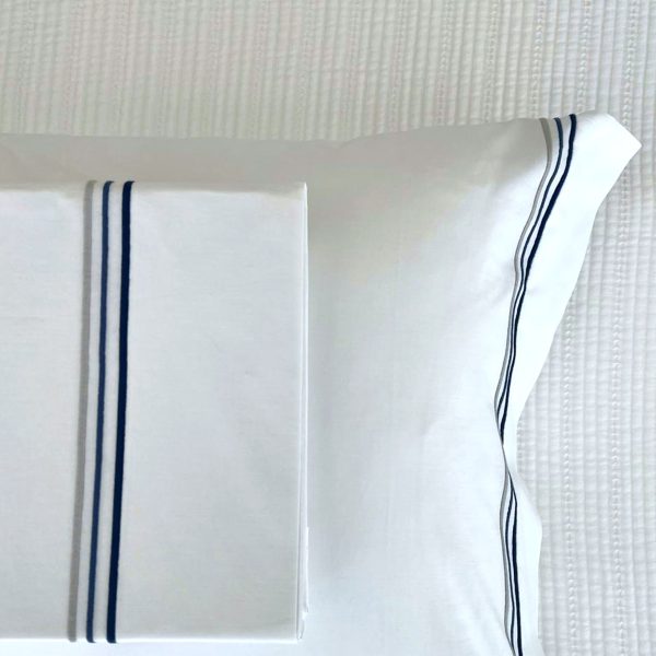 Jogo de lençóis brancos com 3 linhas bordadas (cinza, azul e marinho) ao longo da barra.