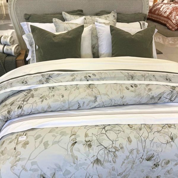 Jogo de lençóis bege claro com barra estampada em tons de verde.