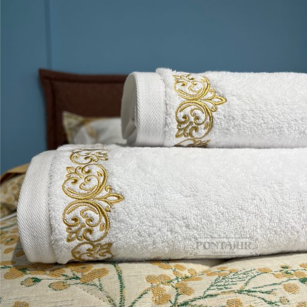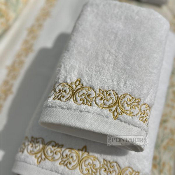Jogo de banho em turco cor branco com bordado de cão salsicha ao centro da barra.