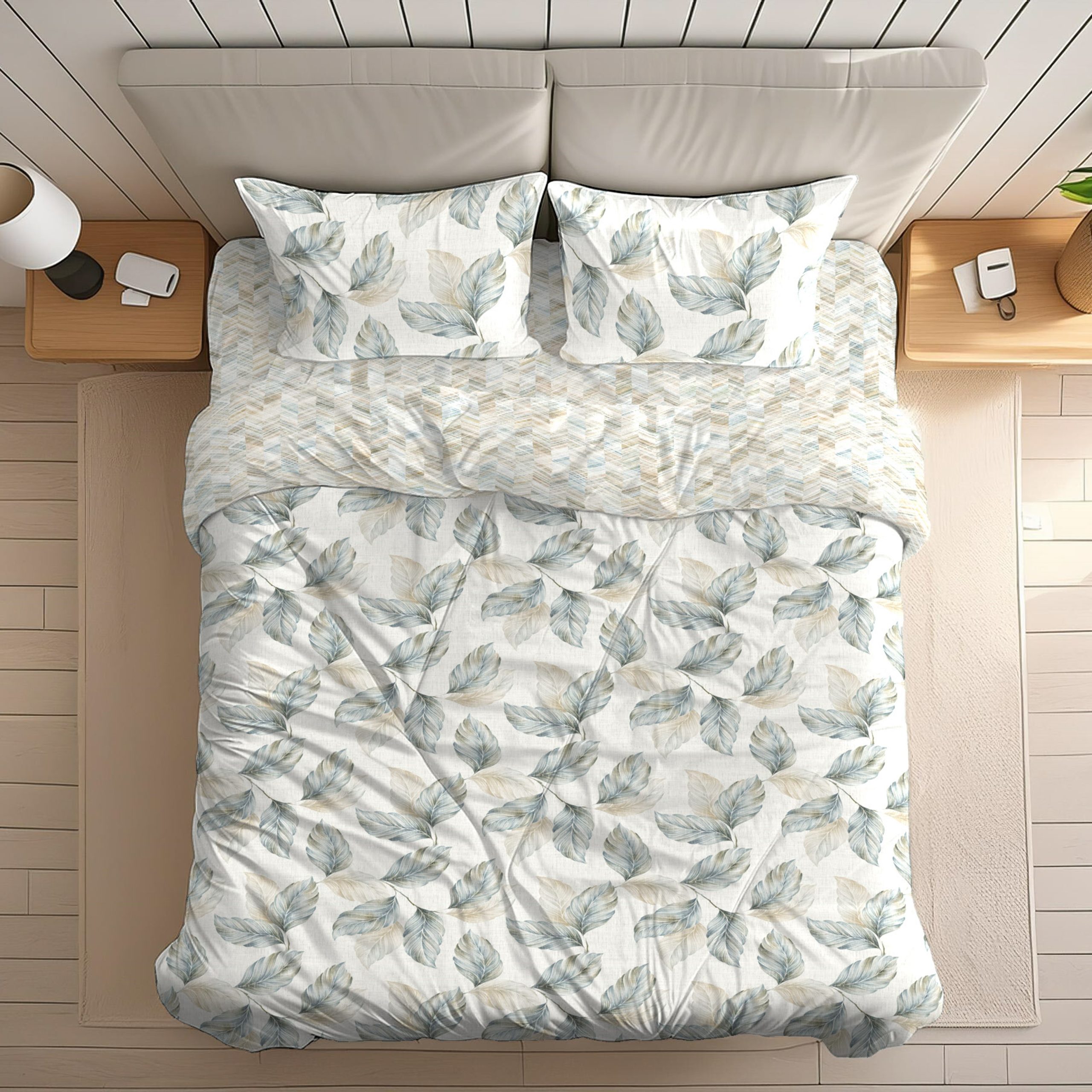 Capa de edredon dupla face, tem uma face com folhas em tons verdes e mostarda e outra face com padão geométrico suave.