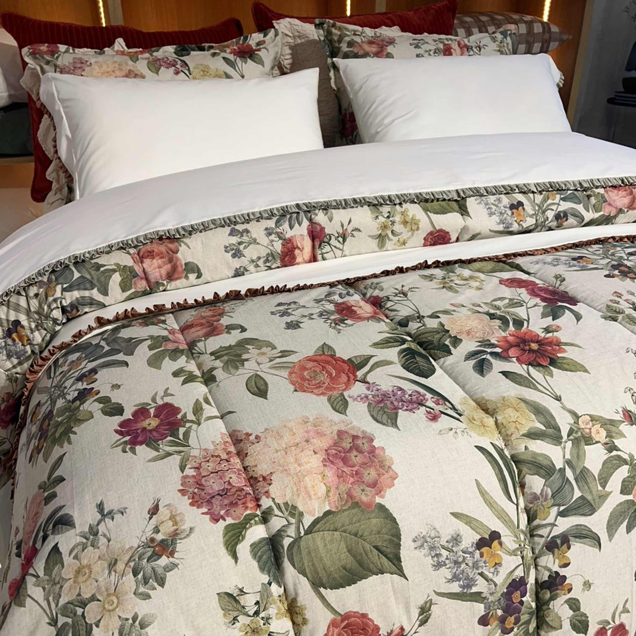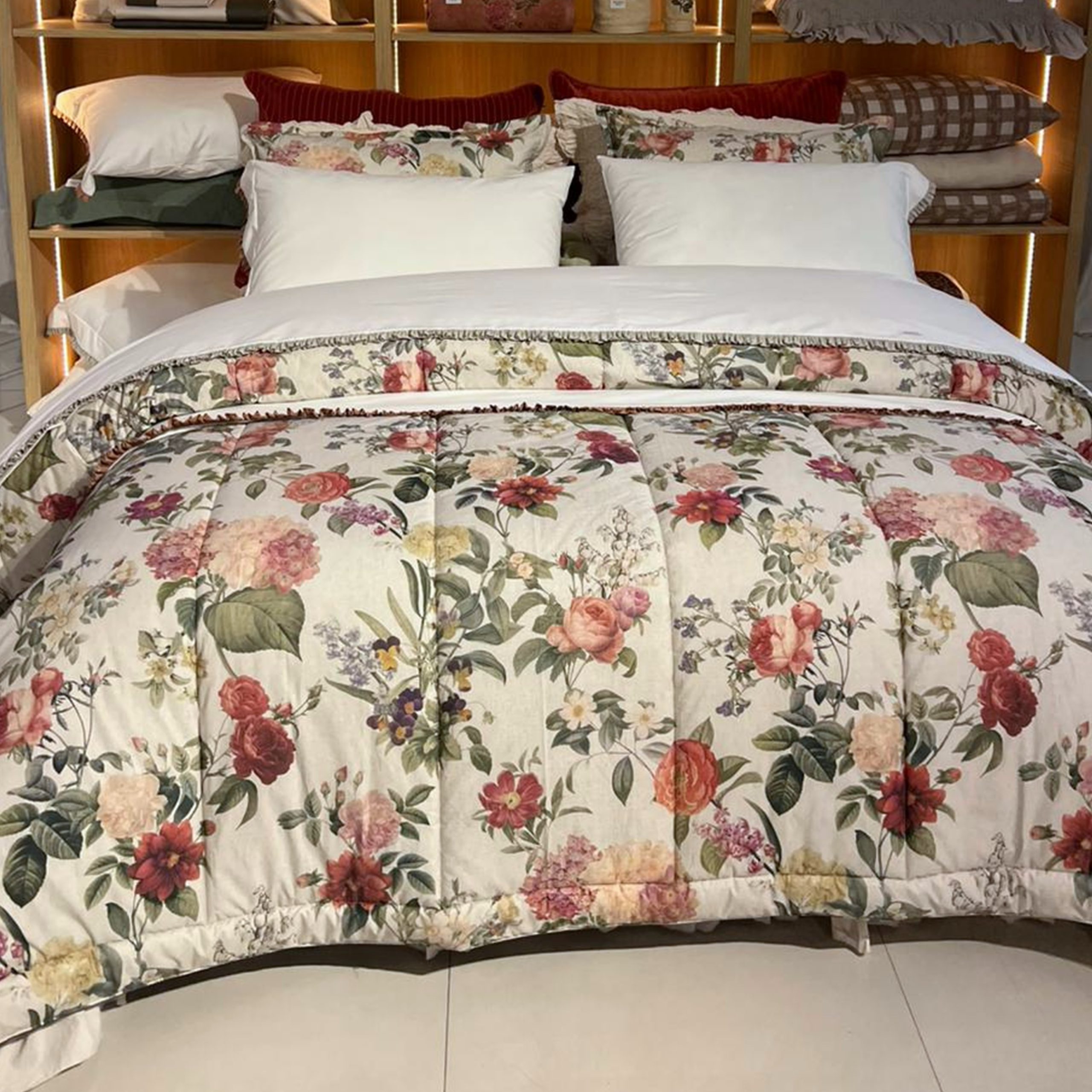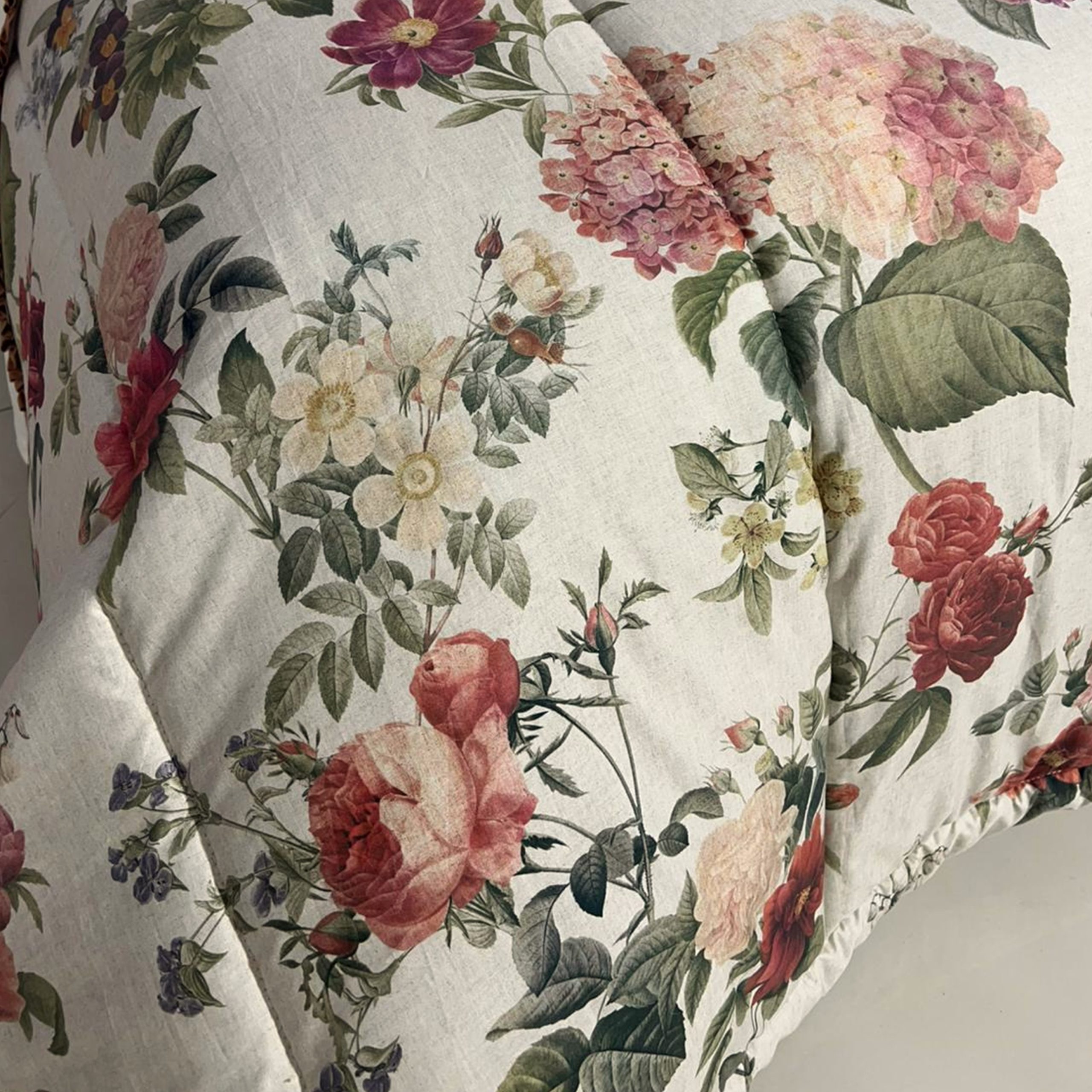 As almofadas tem fecho e enchimento do mesmo tecido do edredon, medida 50x70cm.