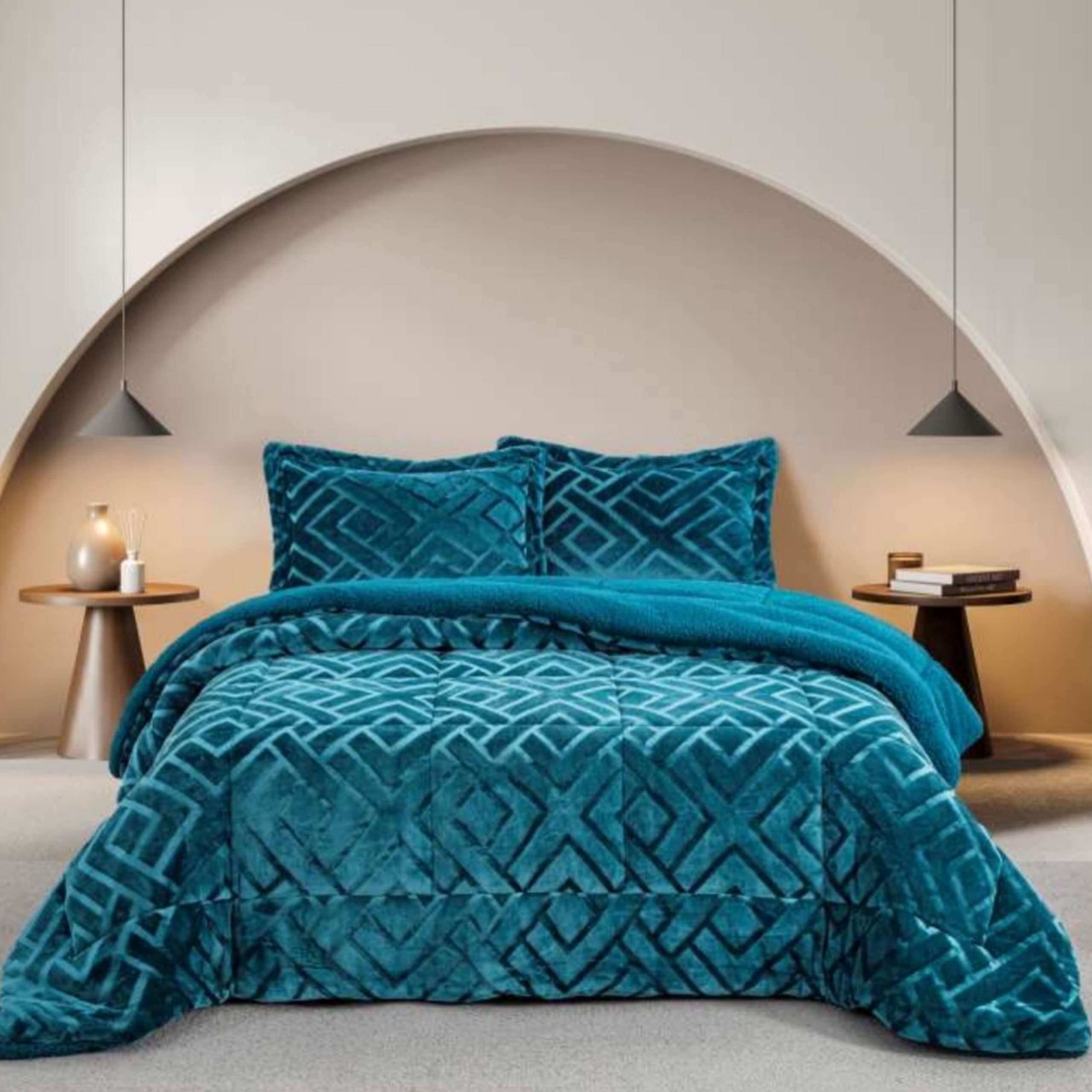 Edredon em coralina com losângulos. A outra face tem “pêlo de borrego”/sherpa.