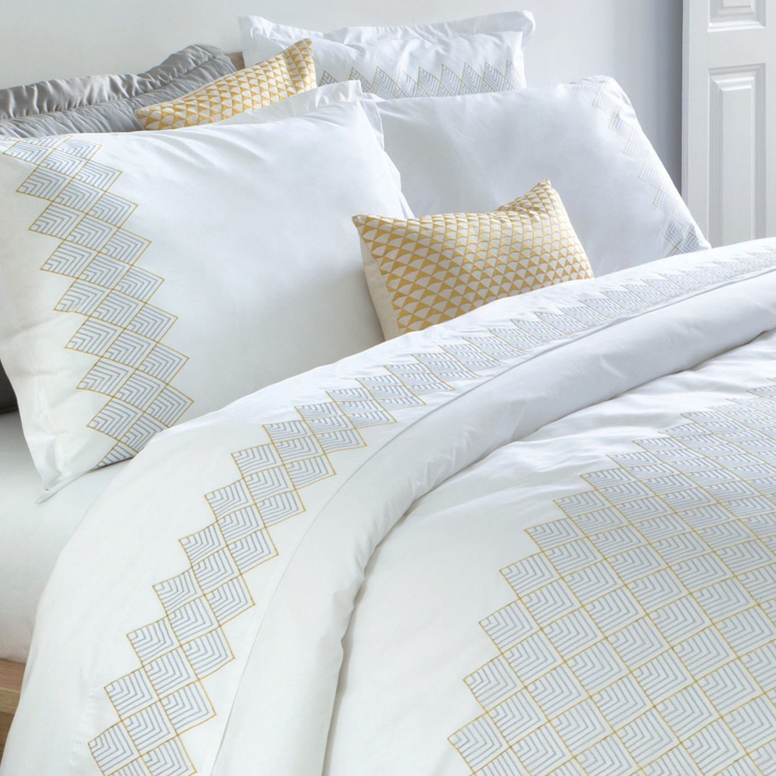 Jogo de lençóis branco com bordado na barra do lençol de cima em tons de cinzento e amarelo.