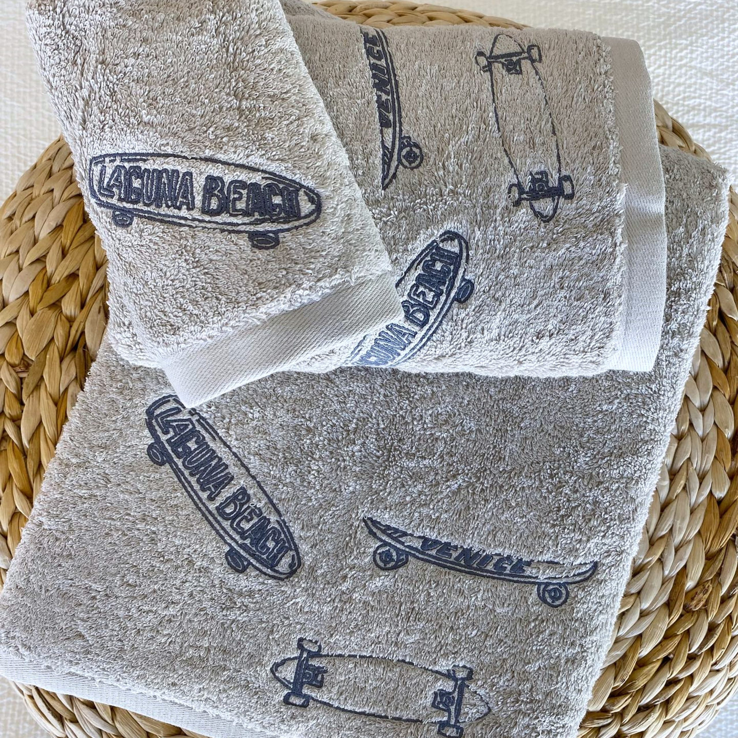 Jogo de banho em turco cinzento com bordado de skates a azul.