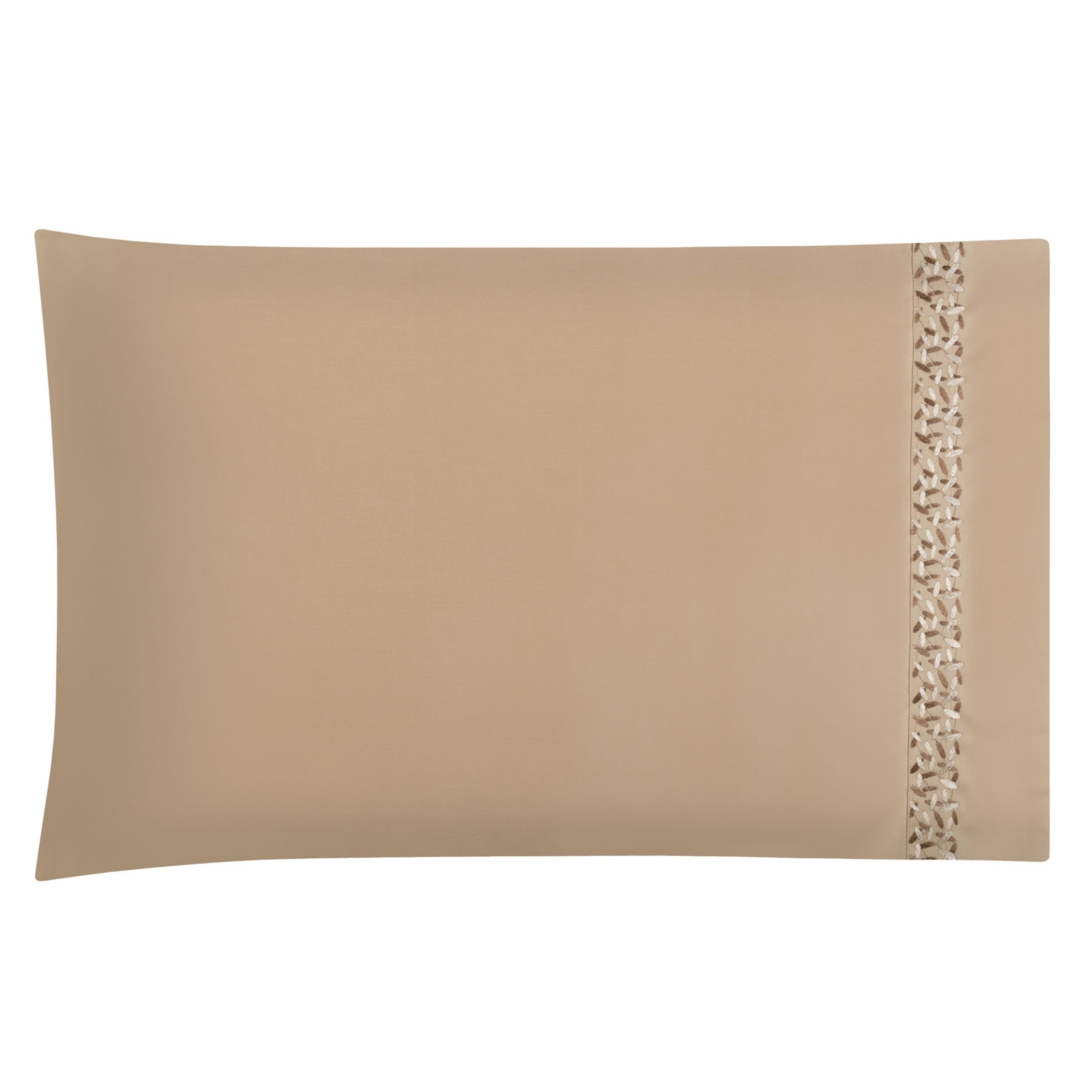 Jogo de lençóis cor castanho/gengibre com bordado castanho e bege.