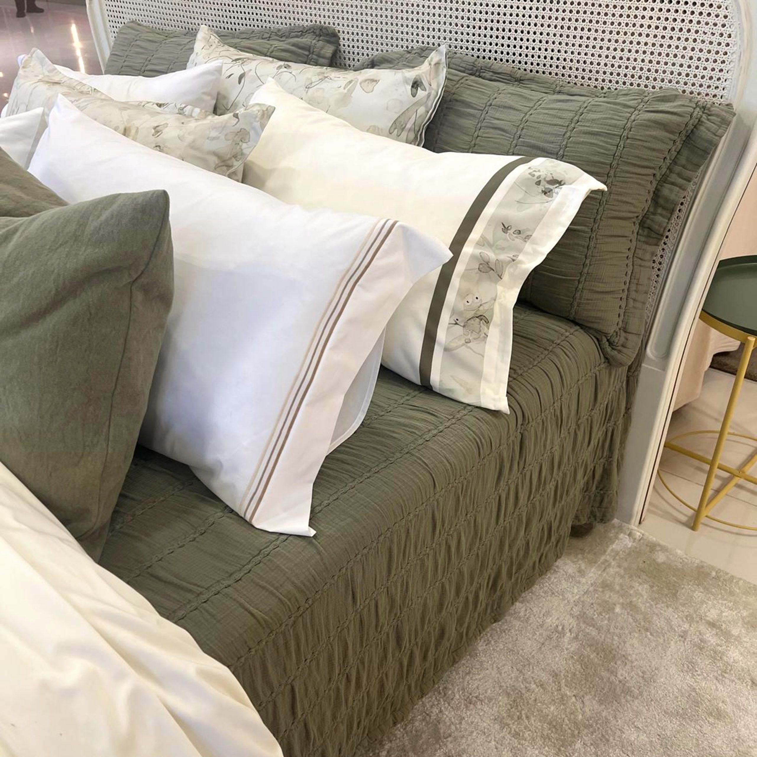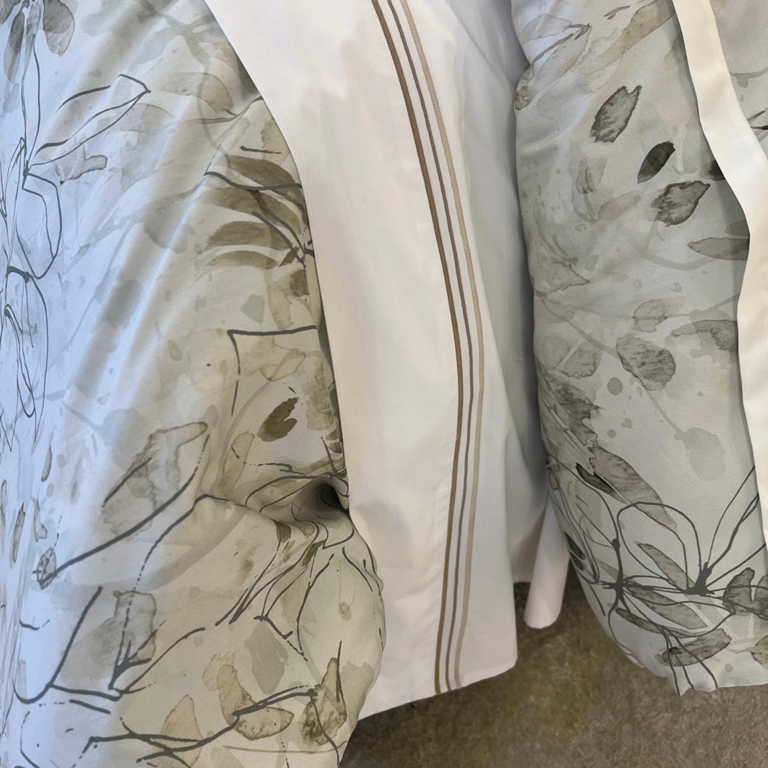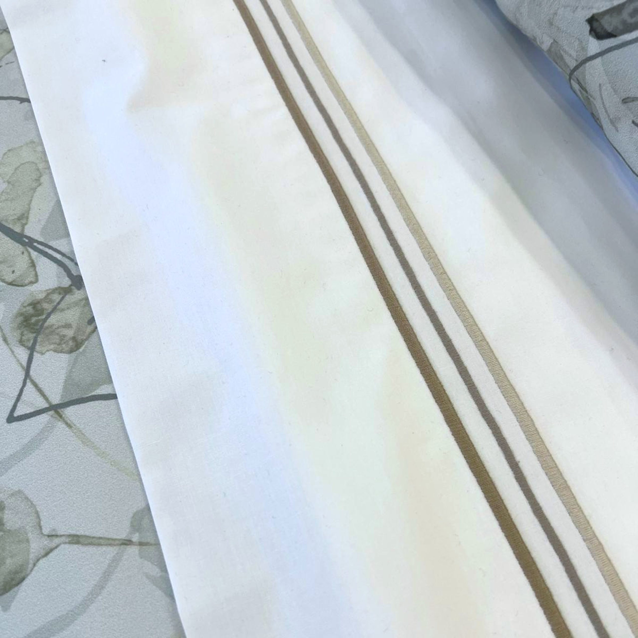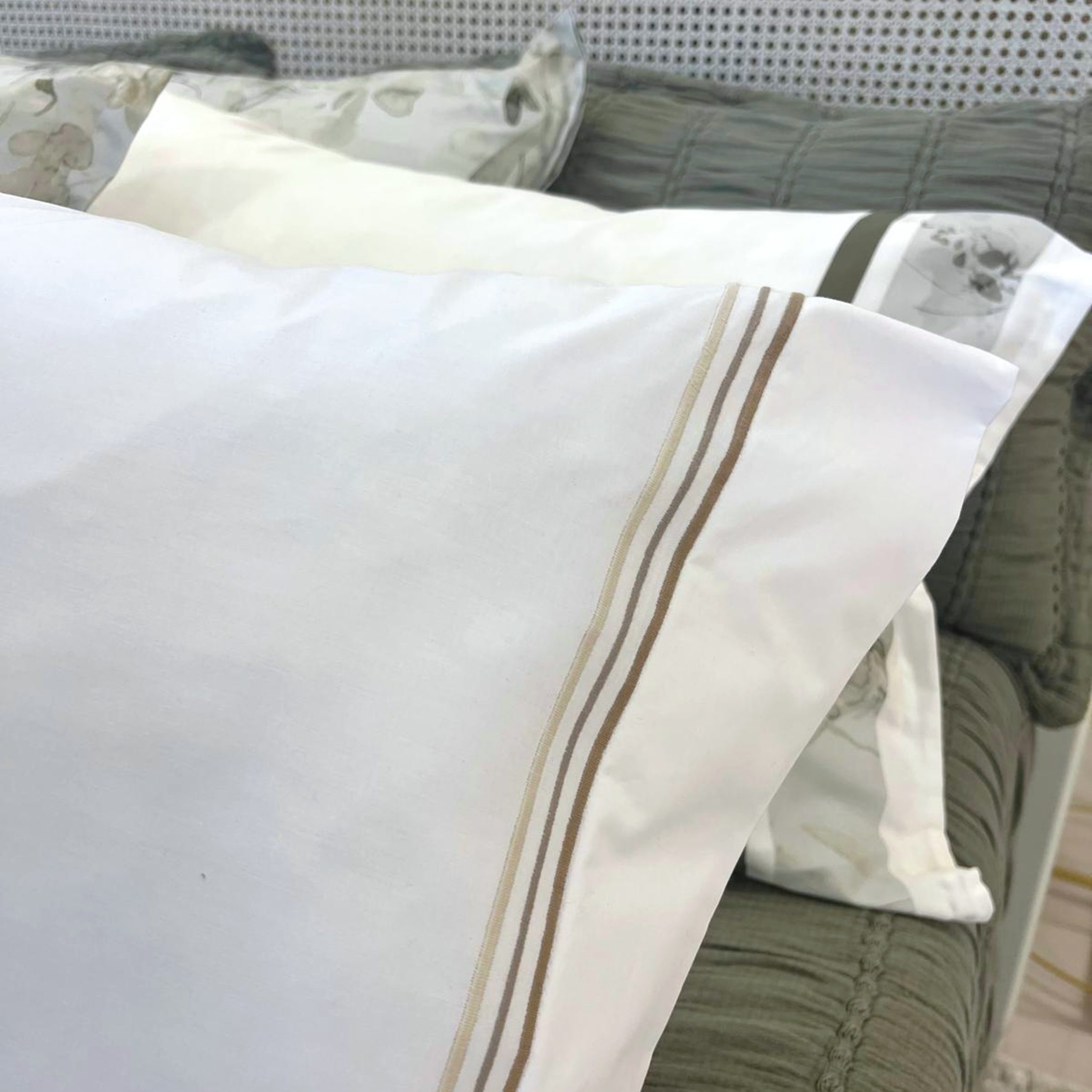 Jogo de lençóis brancos com 3 linhas bordadas (castanho, taupe, bege) ao longo da barra.