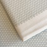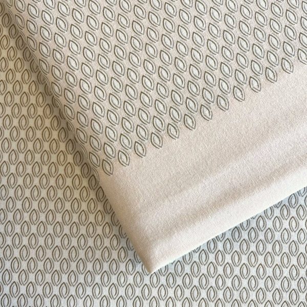 O lençol de baixo é fundo branco com estampado contínuo bege.