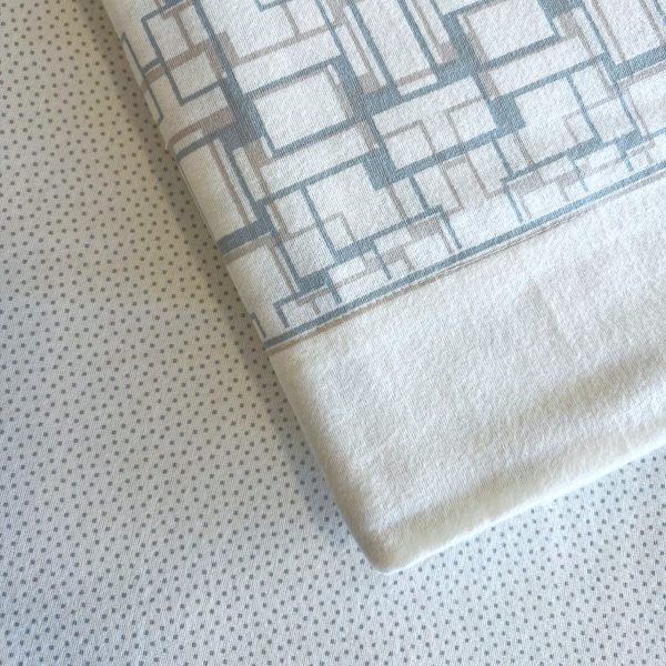 Produzidos em flanela de algodão, este jogo de lençóis tem um padrão contínuo geométrico em tons de bege e azul com uma barra de lençol lisa bege.
