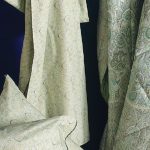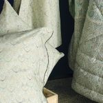 Jogo de lençóis em estampado contínuo com acabamento de linha verde na barra do lençol de cima e nas fronhas de almofada.
