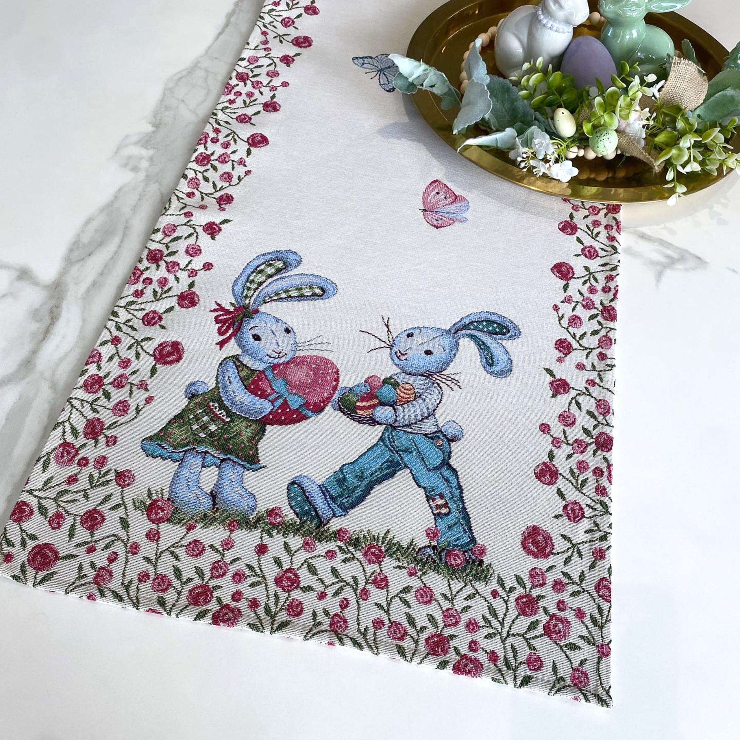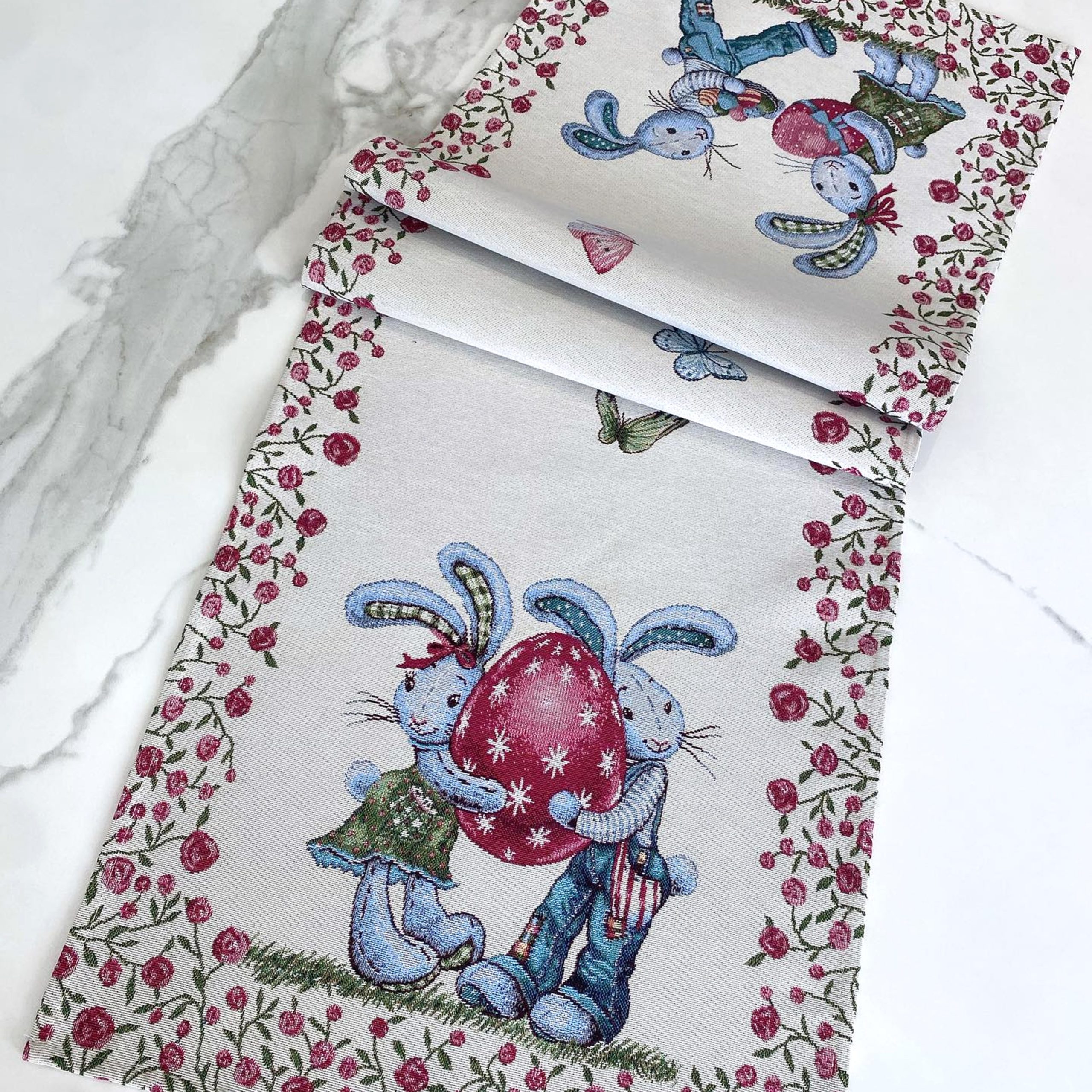 Napron em jacquard com coelhos e ovos de páscoa.