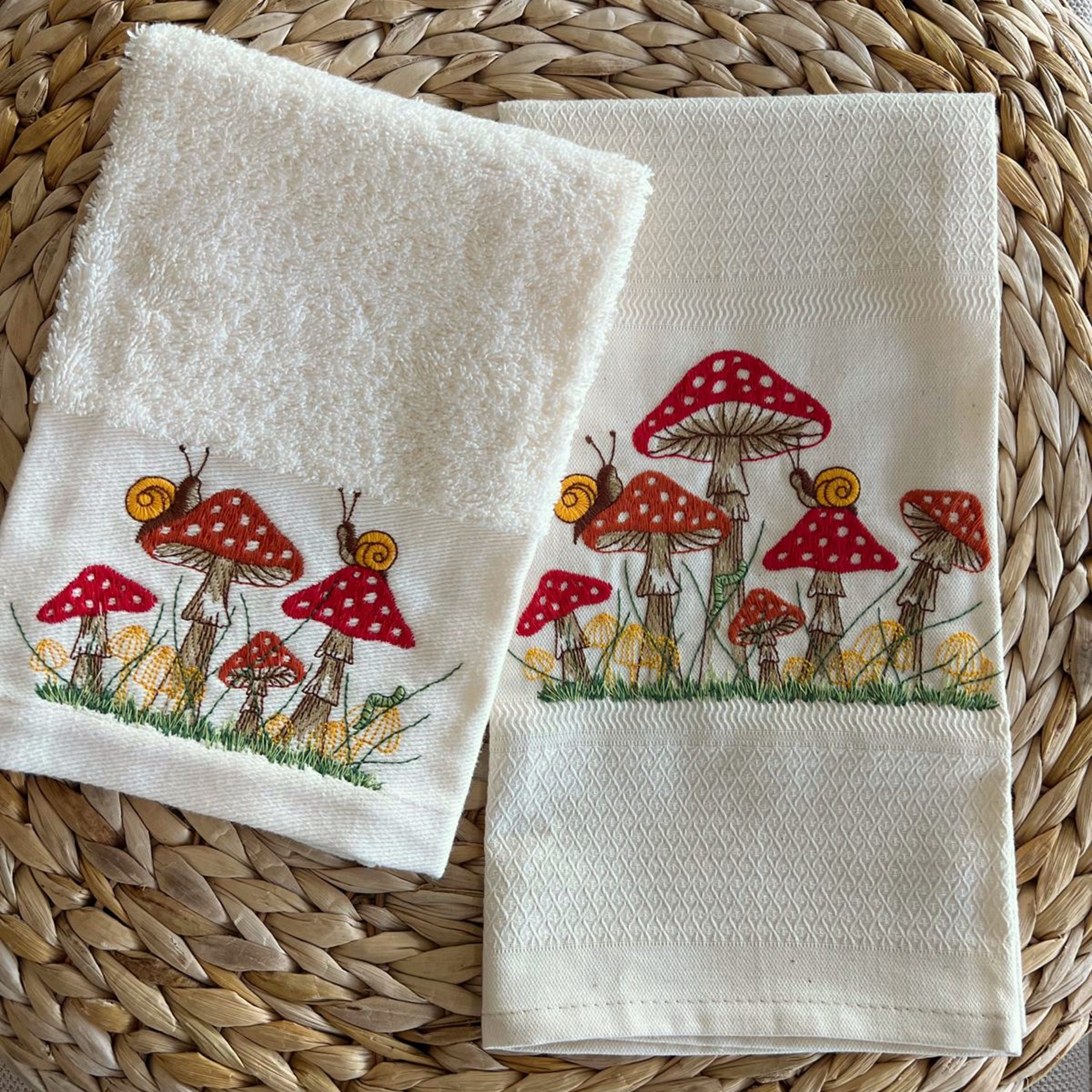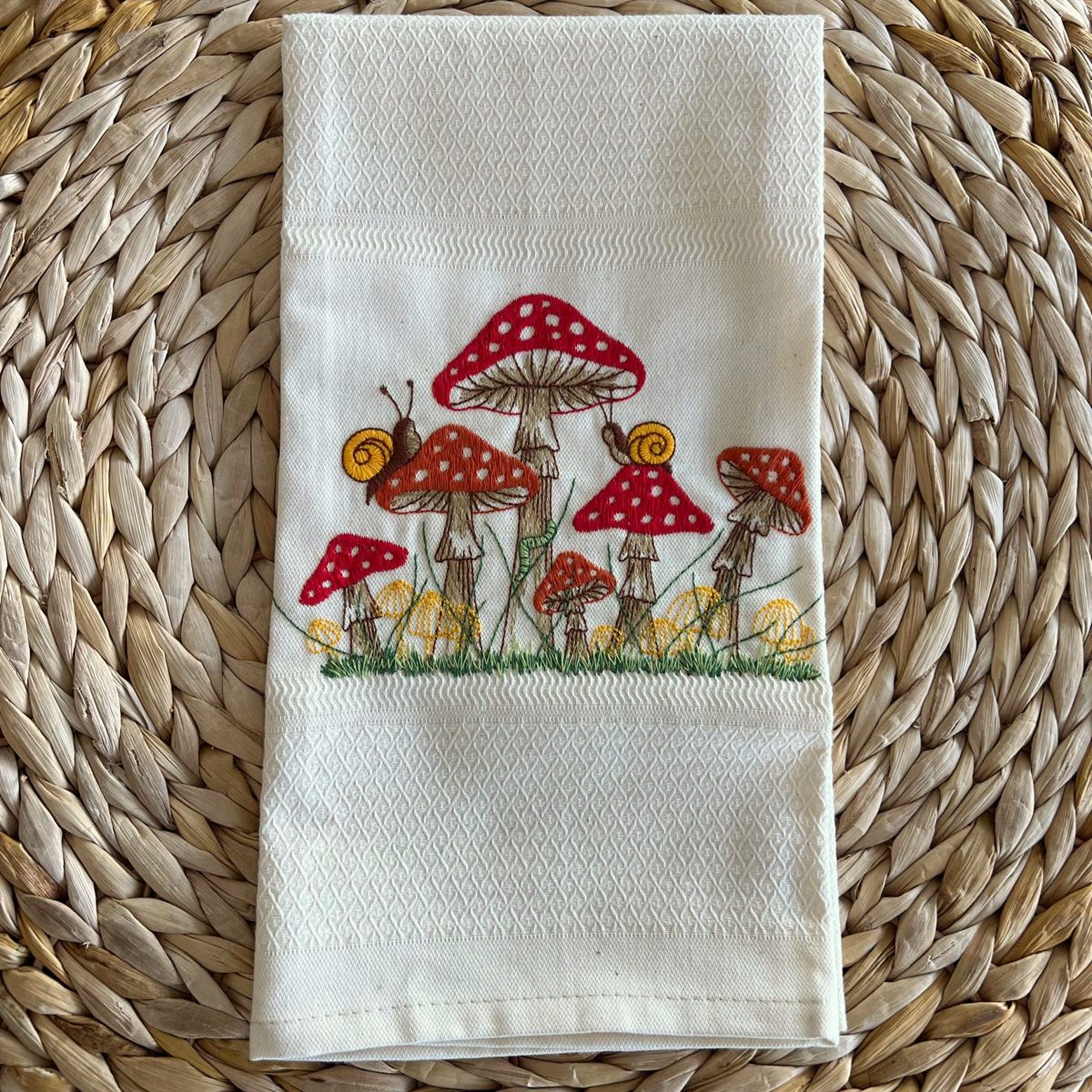 Pano de cozinha bege com bordado de cogumelos ao centro da barra.