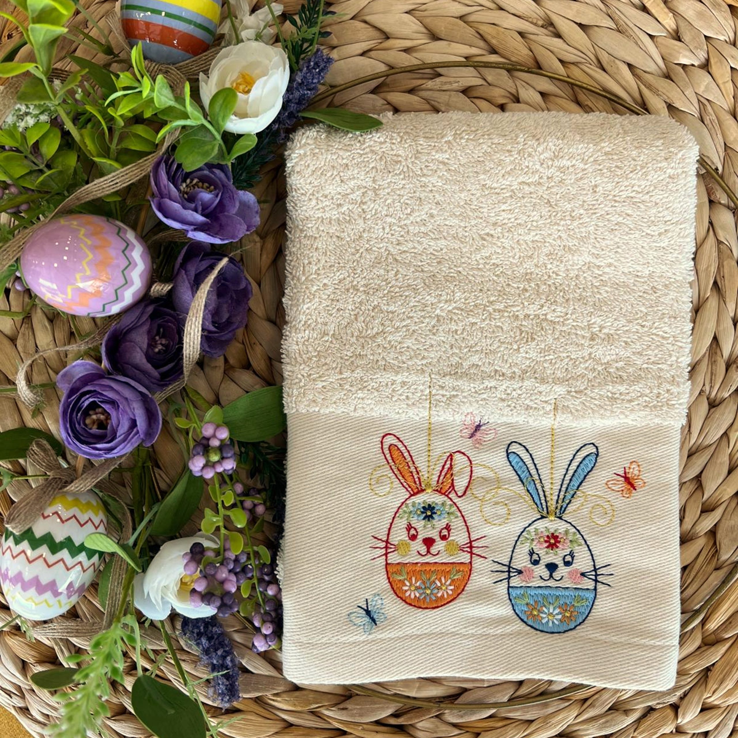 Pano de cozinha em turco bege com bordado de ovos coelhinhos centro da barra.