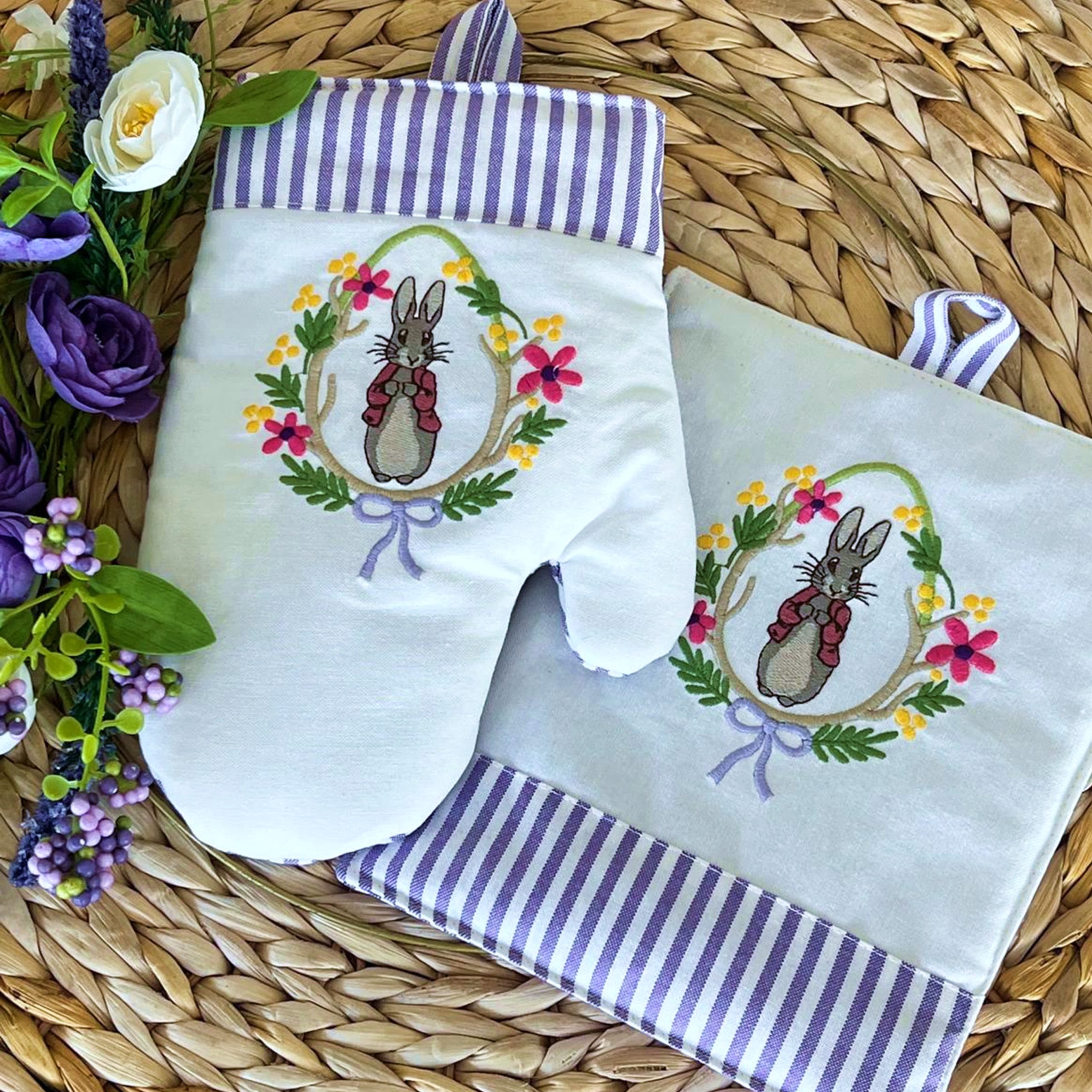 Pega com bordado de coelha e flores.