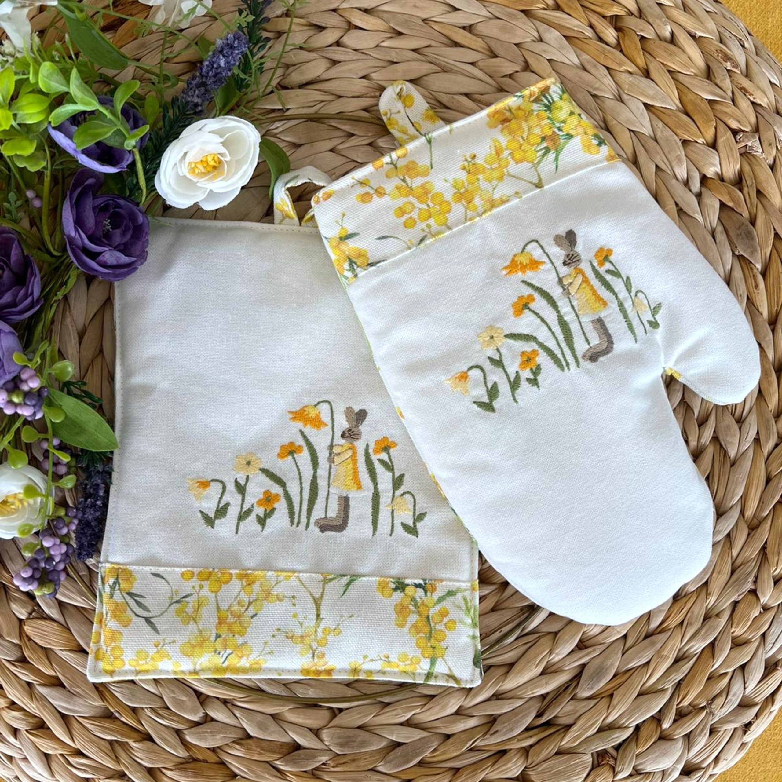 Pega com bordado de coelhos e flores. Tem pega para pendurar.