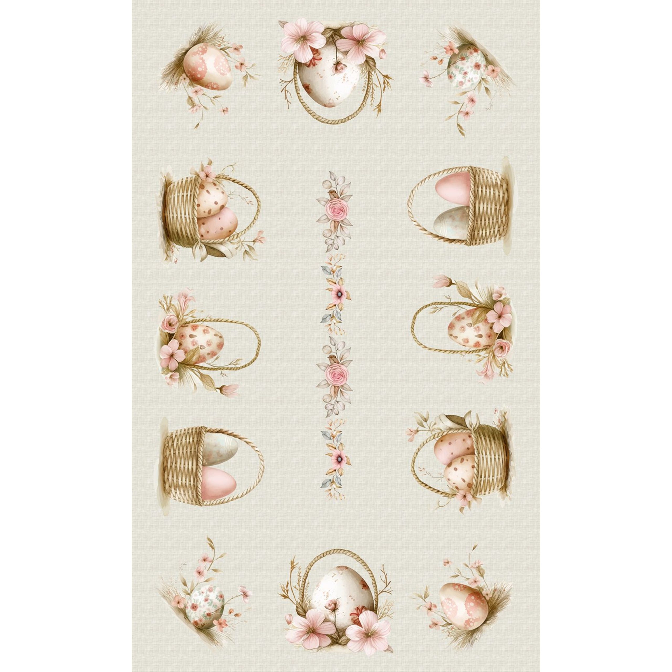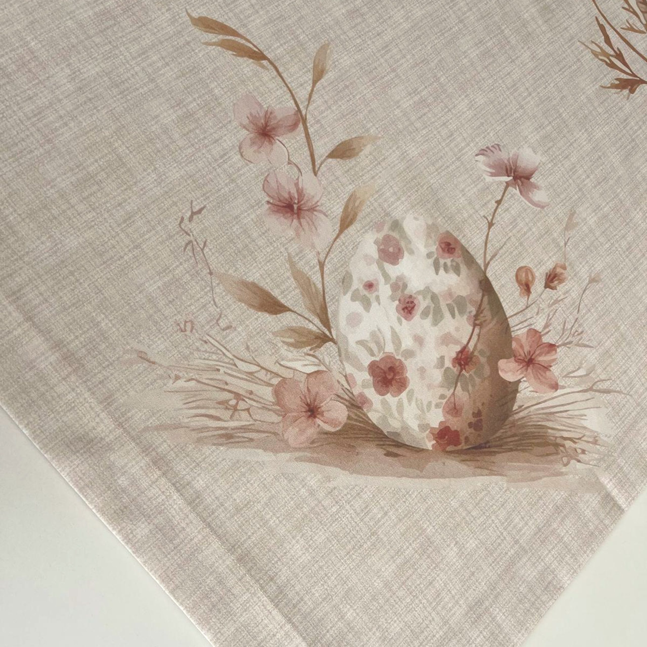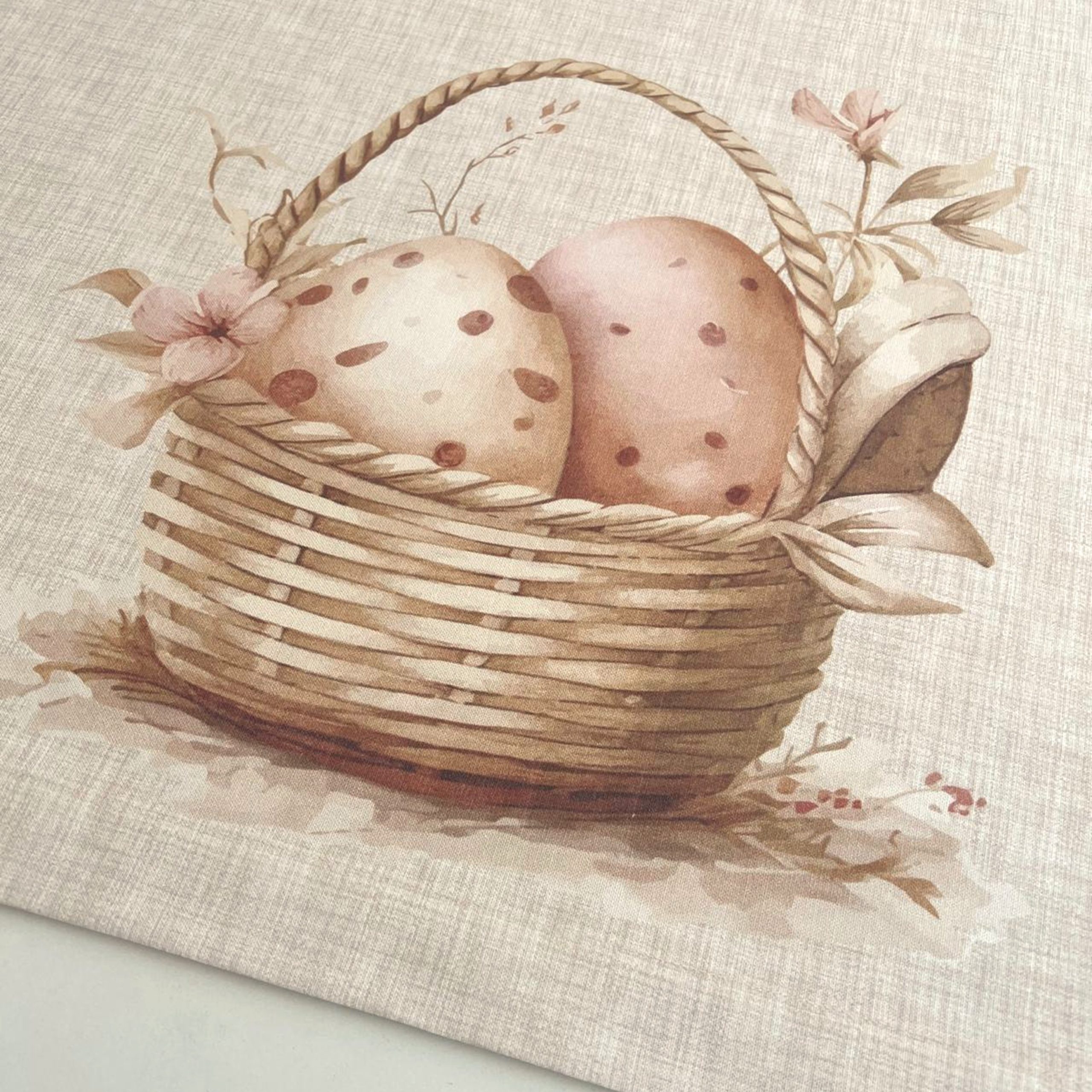 Toalha de mesa de fundo bege com estampado de cestas com ovos de Páscoa.