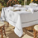 Toalha de mesa branca com bordado de bolas com dourado ao centro da toalha.