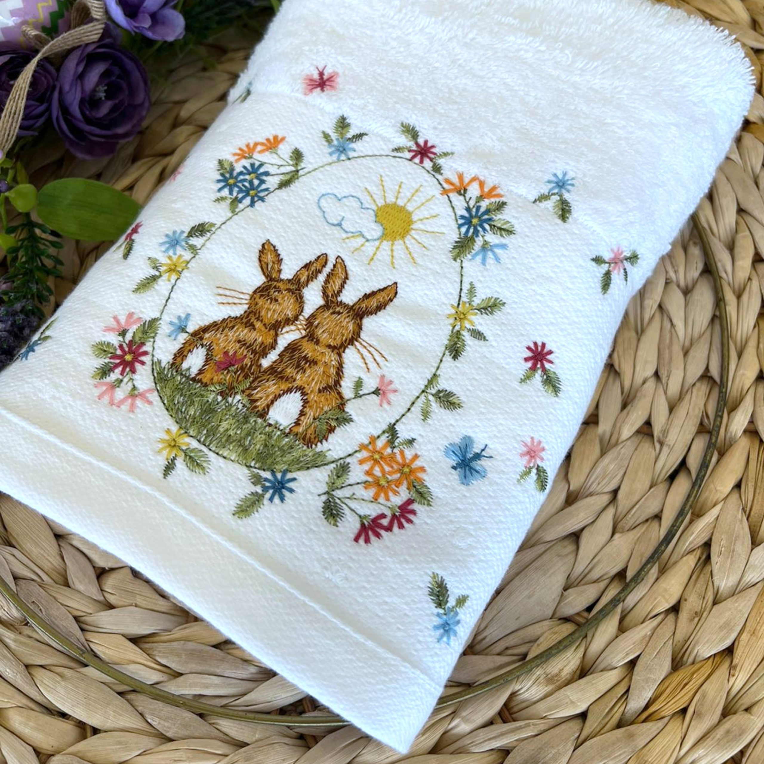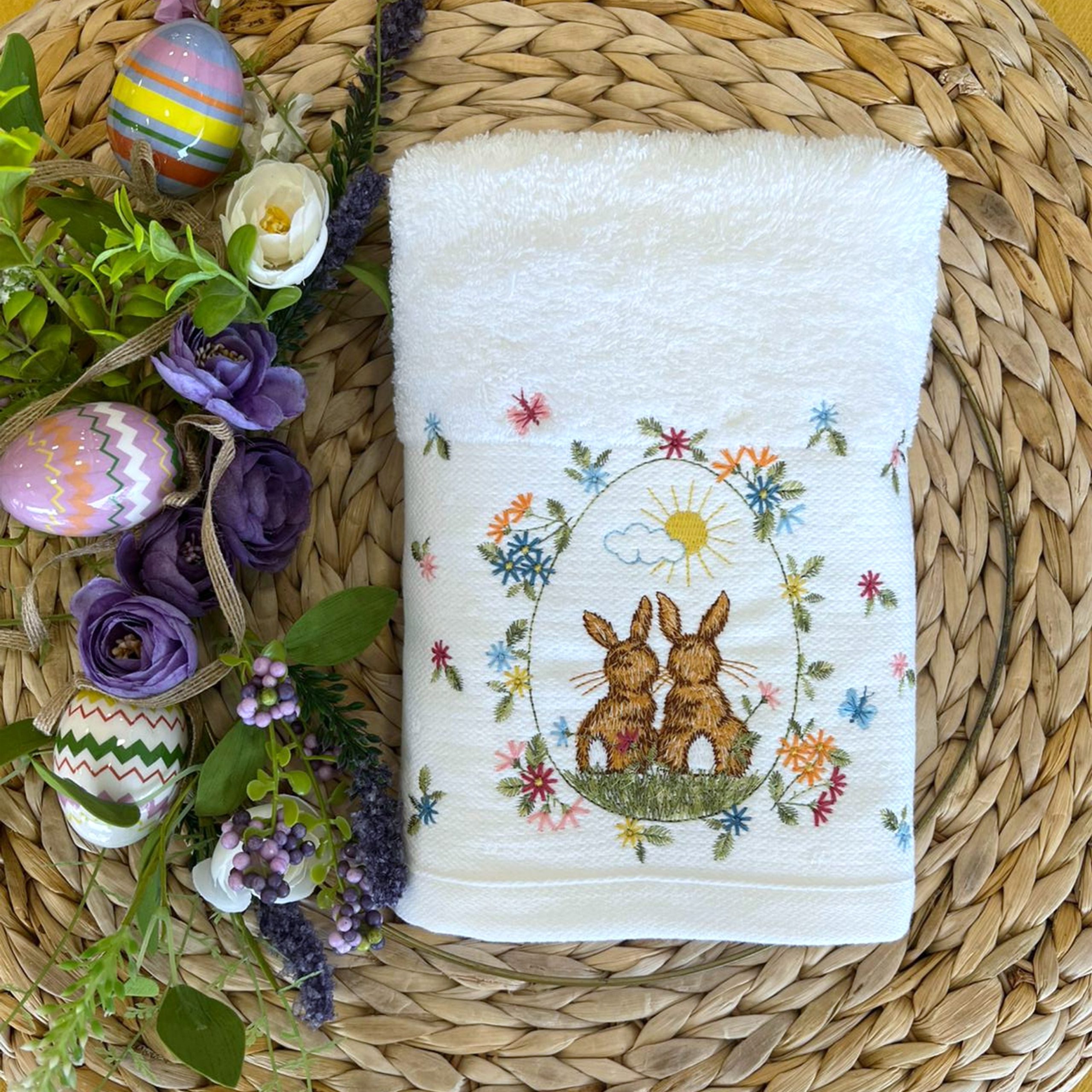 Toalha em turco branco com bordado de coelhos e flores ao centro da barra.