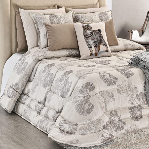 Edredon bege com Jacquard cinza prata ao centro. Inclui 2 almofadas 45x60cm com fecho e enchimento lisas em cinza prata.