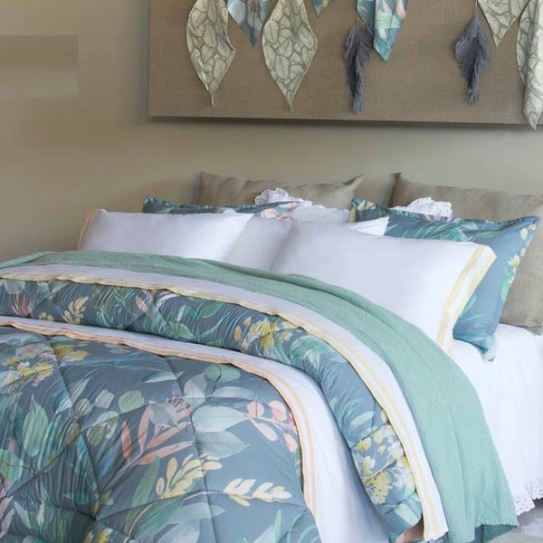 Colcha/edredon com estampado de folhas em tons suaves. A outra face do edredon é lisa em cor verde água.