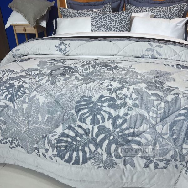Edredon com estampado floral contínuo com fundo cinzento. A outra face é lisa em tecido 100% algodão.