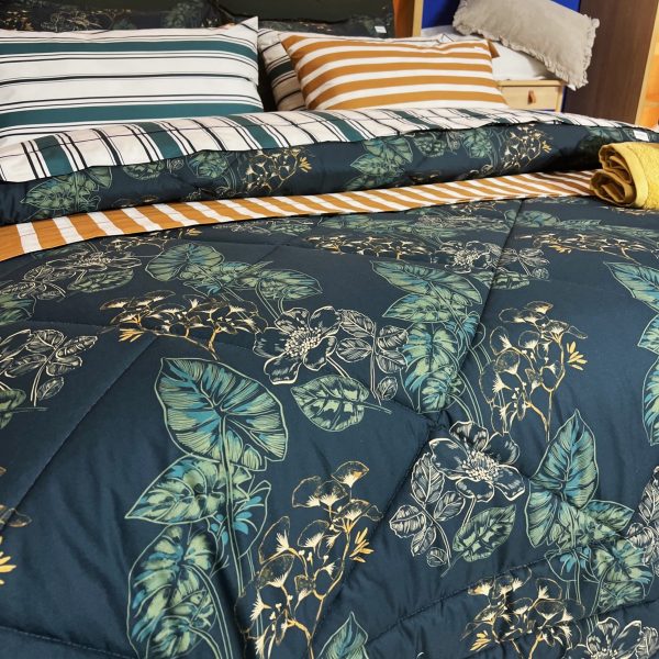 Edredon azul escuro com estampado de folhas em verde e amarelo.