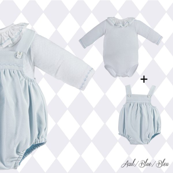 Inclui body gola com bordado azul. O body tem molas nas costas e entre pernas.