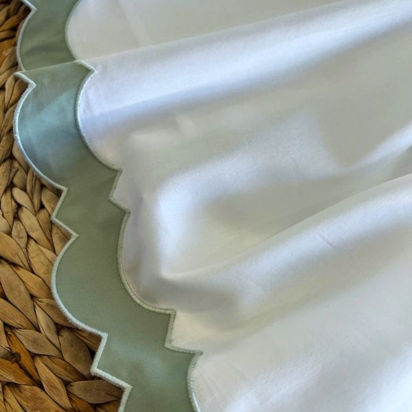 Jogo de lençóis branco com aplicação de barra de recorte verde no lençol de cima e nas almofadas, num lado.