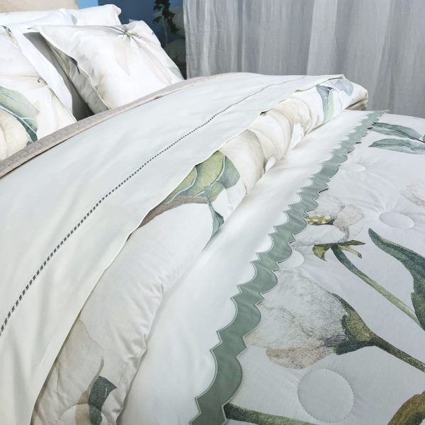 O lençol de cima tem aplicação de barra bordada com ramos bege escuro.