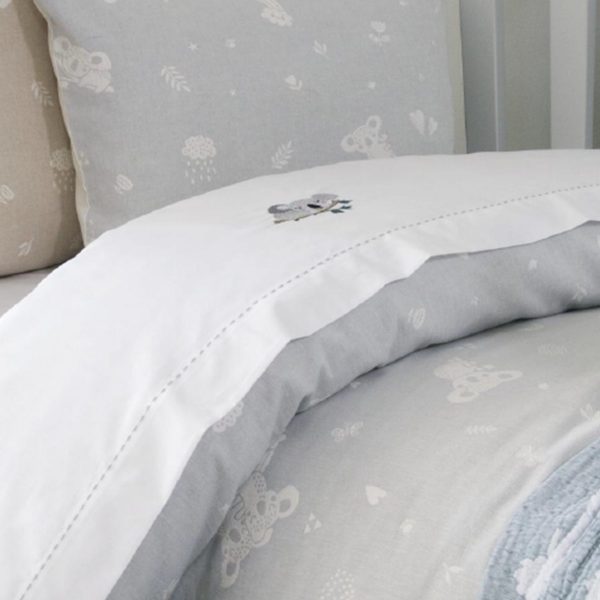 Jogo de lençóis brancos com Koala bordado ao centro. O lençol de baixo é liso branco e a fronha tem bordado na lateral.