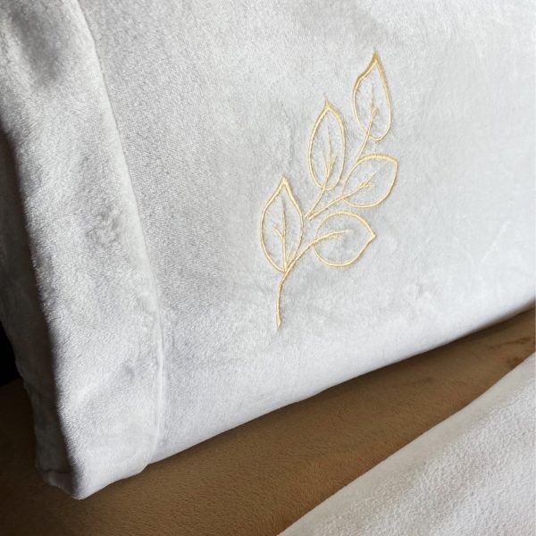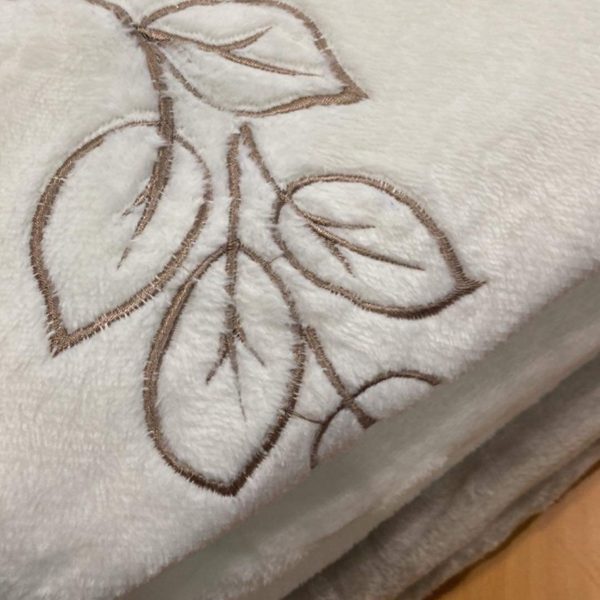 Neste jogo de lençóis, o lençol de cima bege claro tem 3 bordados de folhas em tons azul na barra do lençol.